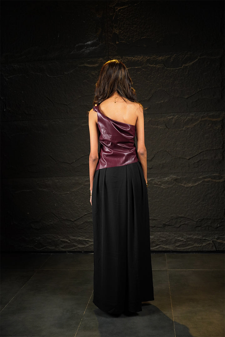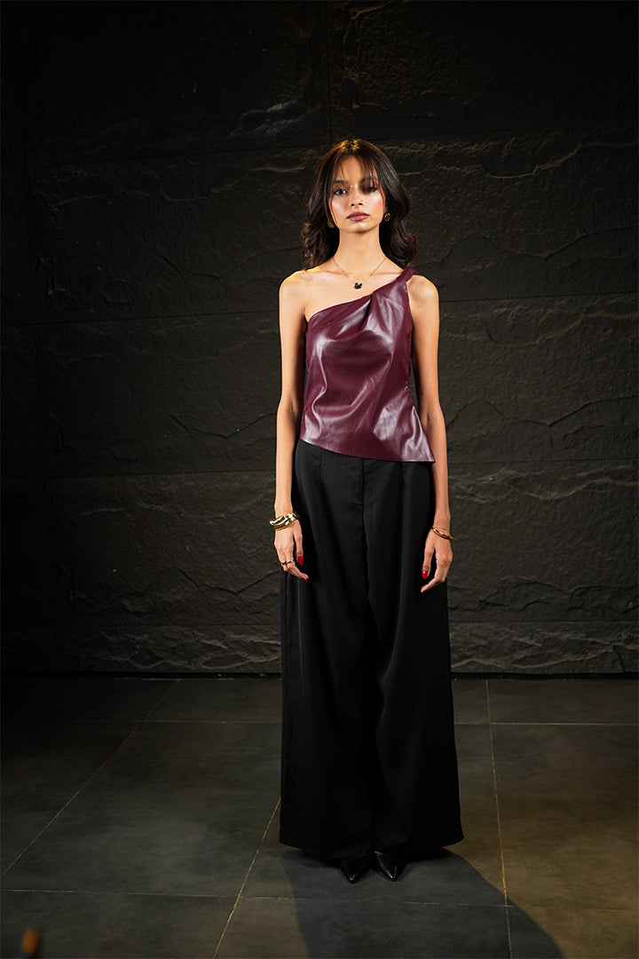 This deep maroon faux leather top is designed with a striking one-shoulder neckline. Its fitted, bodysuit-style silhouette ensures a seamless, smooth fit under any bottom, commanding attention with its rich texture and color. Detail: One-shoulder neckline. Material: Deep maroon faux leather.