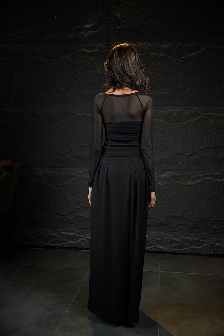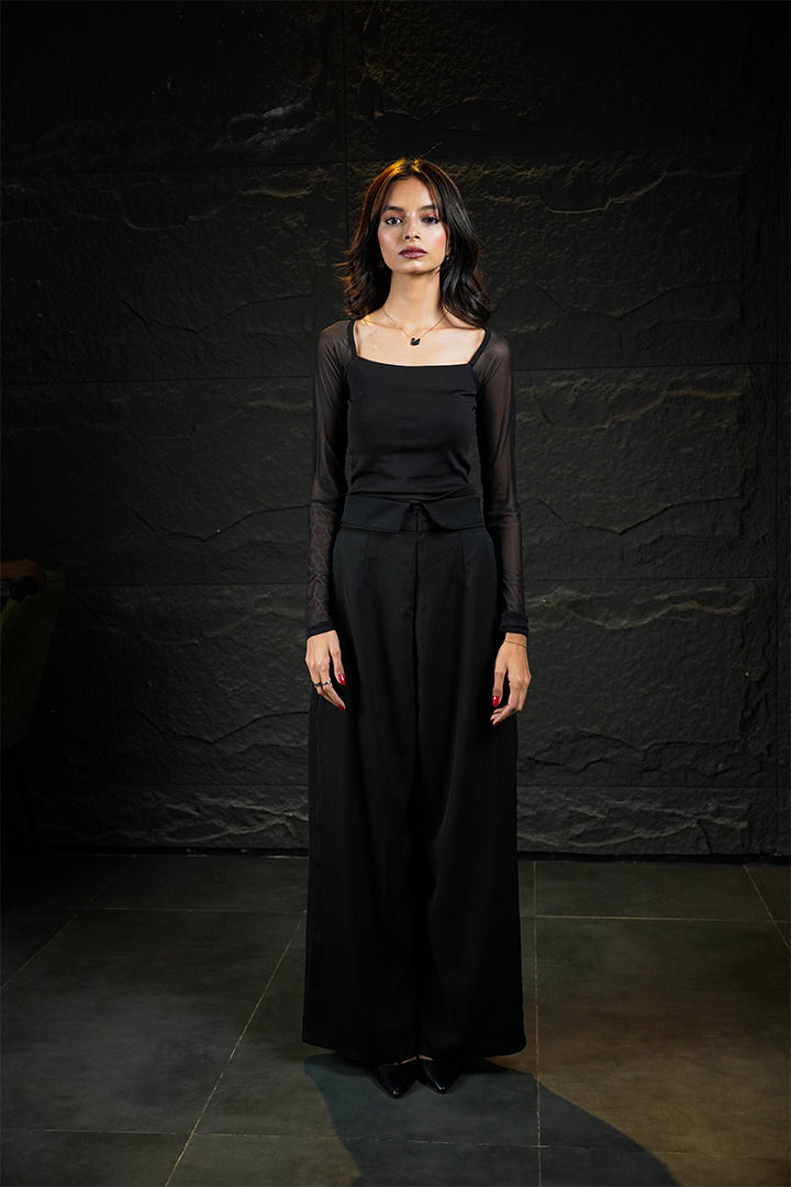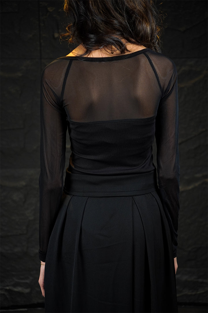 The Manhattan is a fitted black square-neck tank top that transitions into sheer, mesh full sleeves. Its sophisticated design and breathable, structured fabric make it perfect for a subtle evening look. Key features: Square neckline, sheer mesh sleeves. Vibe: Understated glamour.