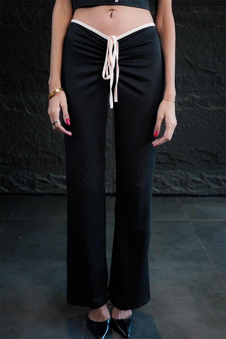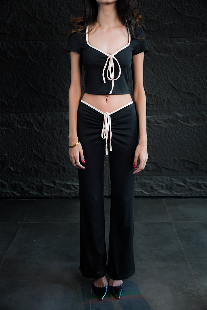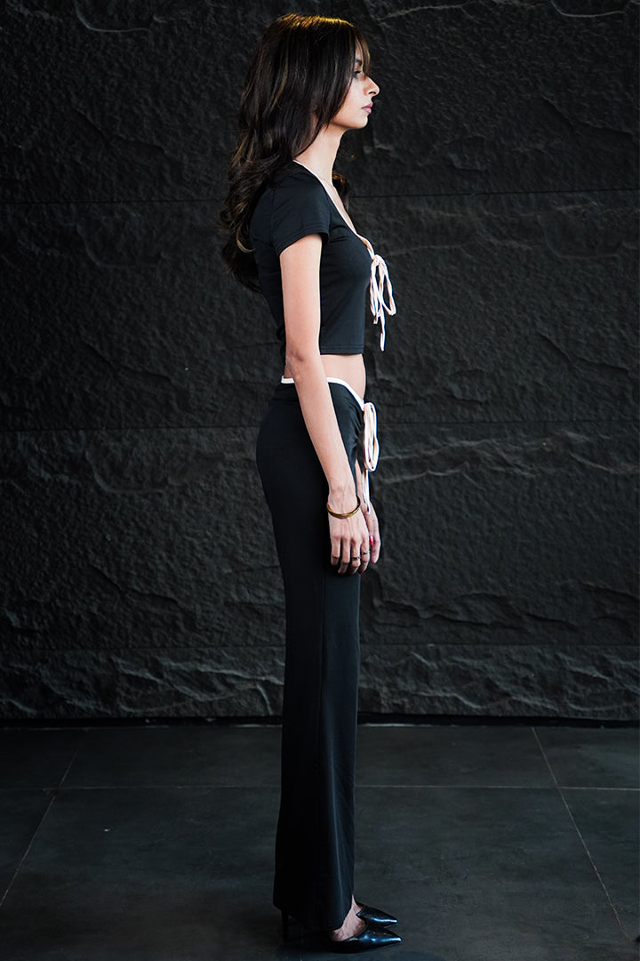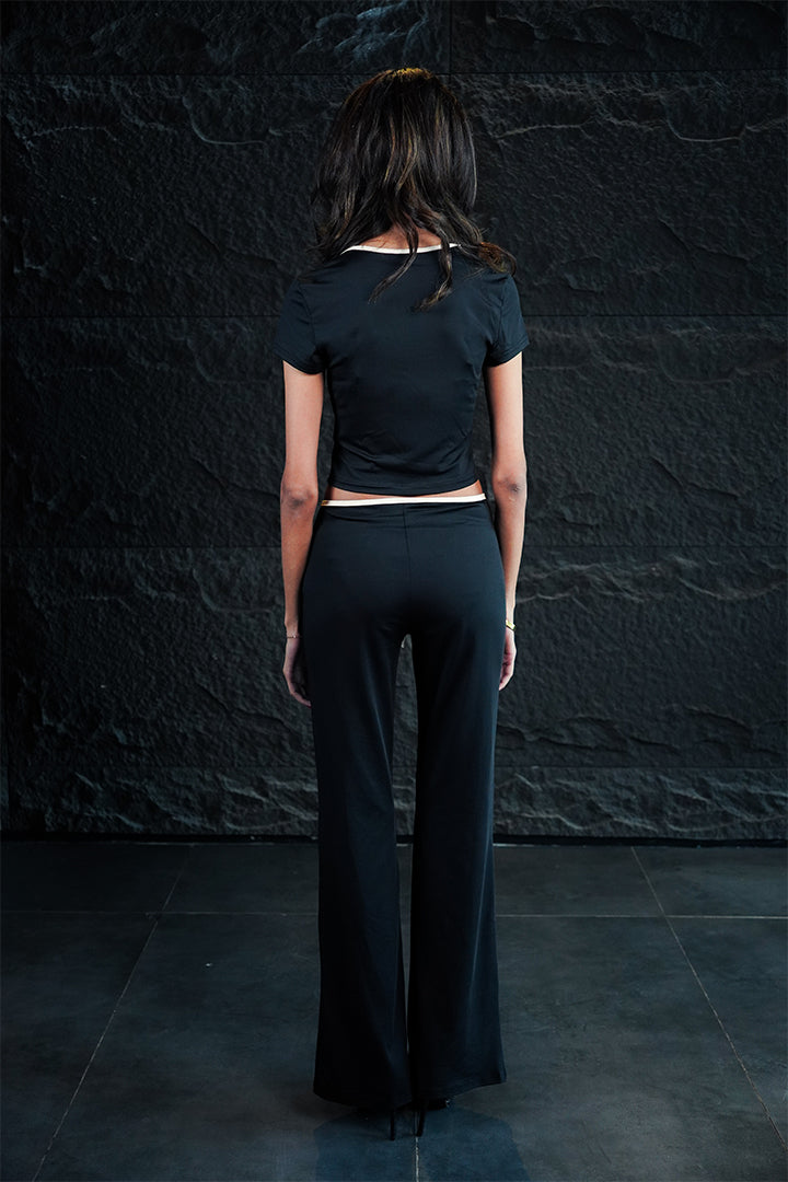 The ultimate in sharp, contemporary chic. The Regina set features a fitted, low-rise pant that slims and lengthens, paired with a matching structured crop top accented by delicate bow detailing. Designed in classic black and white, this ensemble transitions effortlessly from a fashion-forward meeting to an evening event. Fit: Fitted, stretchable low-rise pants. Styling: Pair with pointed heels and minimal jewelry for a powerful look.